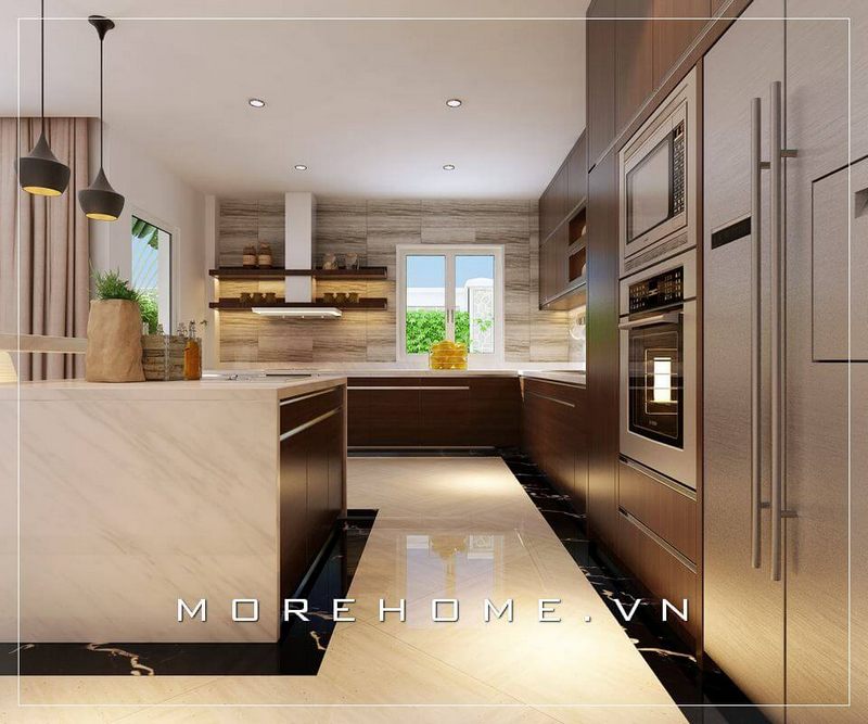 Mẫu tủ bếp chữ U gỗ tự nhiên màu nâu hiện đại, sang trọng cho phòng bếp biệt thự