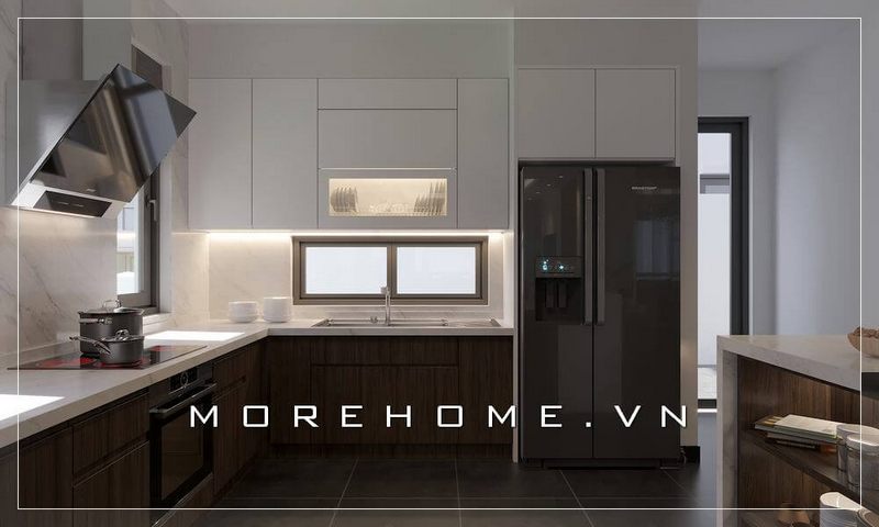 Hệ thống bếp được thiết kế với chất liệu gỗ công nghiệp thiết kế hiện đại và tiện nghi