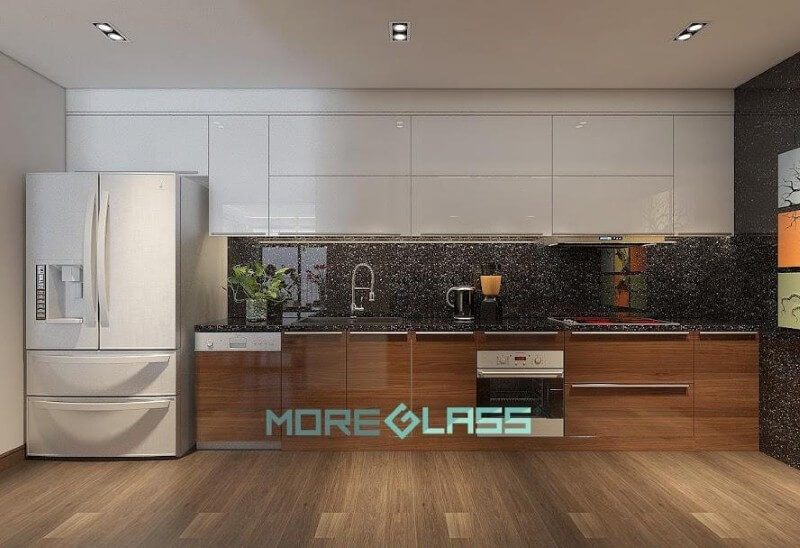 Thiết kế, thi công mẫu kính ốp bếp màu đen kim sa đẹp cho chung cư, biệt thự, nhà phố.