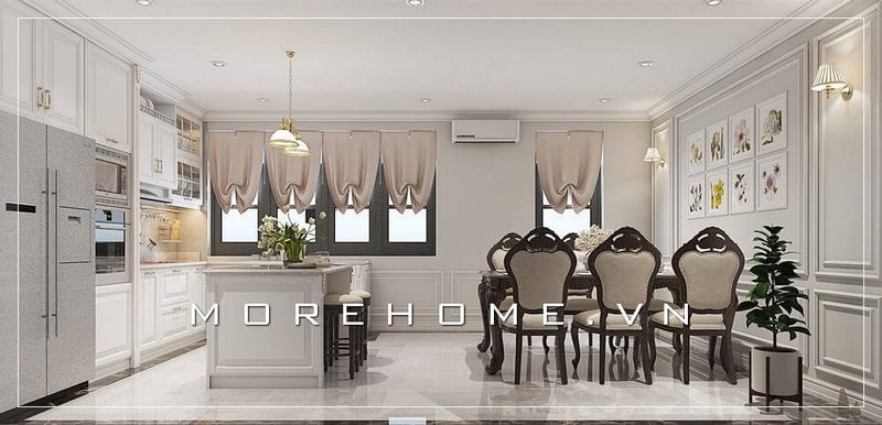 Thiết kế nội thất phòng bếp biệt thự tân cổ điển sang trọng, sử dụng tone màu trắng chủ đẹp cho căn bếp mang đến sự nhẹ nhàng, tinh tế và không gian tiện nghi