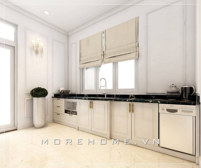 Mẫu tủ bếp gỗ đẹp tân cổ điển màu trắng cao cấp, tiện nghi cho phòng bếp