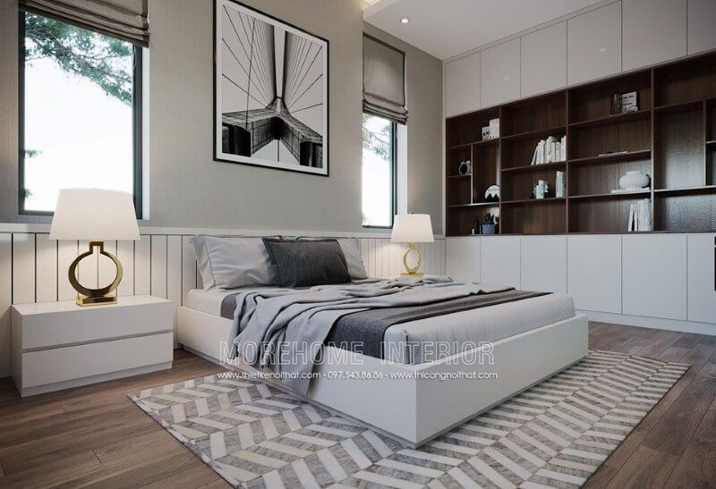 Tủ kệ đựng đồ phòng ngủ tuy chiếm nhiều diện tích nhưng với lớp phủ sơn trắng giúp căn phòng trở nên thông thoáng, đẹp mắt.