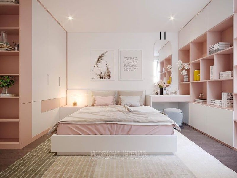 Nội thất phòng ngủ bé gái hiện đại, gam màu trắng chủ đạo kết hợp màu hồng nhẹ nhàng tạo nên không gian đầy nữ tính và đẹp mắt hơn