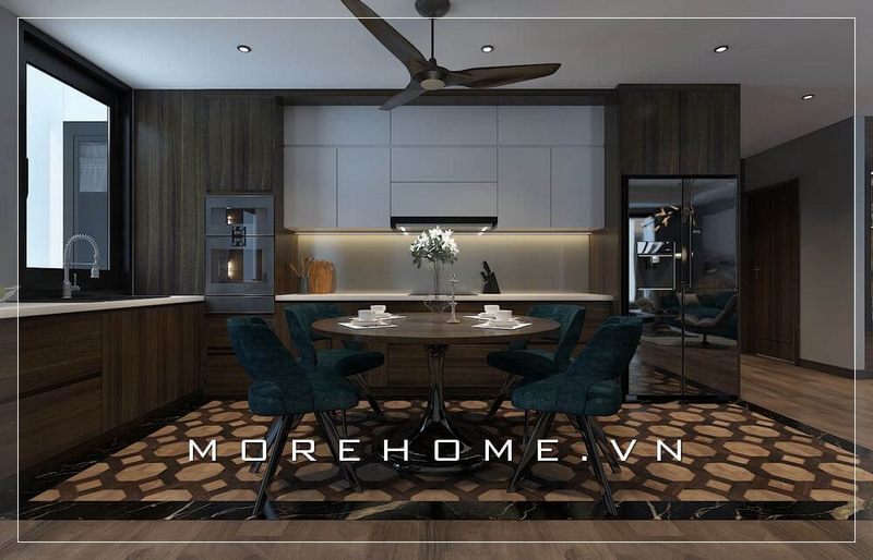 Tủ bếp gỗ Veneer óc chó với màu sắc nâu trầm sang trọng, đá ốp bếp nhân tạo sáng màu được sử dụng tạo điểm nhấn đẹp mang lại sự sang trọng, trẻ trung hơn