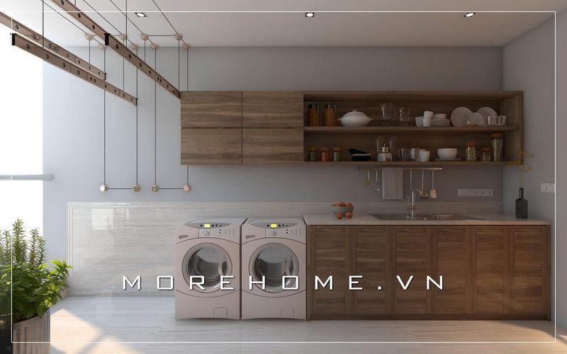 Mẫu tủ bếp gỗ công nghiệp màu nâu đơn giản kết hợp cùng thiết bị phòng bếp hiện đại tạo nên không gian tiện nghi cho người đầu bếp