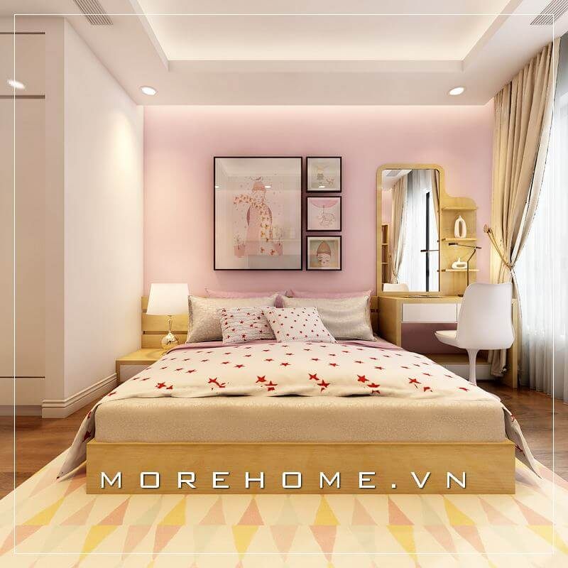 Giường ngủ gỗ công nghiệp với gam màu vàng gỗ, thiết kế theo phong cách hiện đại, đơn giản mang lại cho không gian phòng ngủ chung cư thêm phần sinh động, thoải mái hơn
