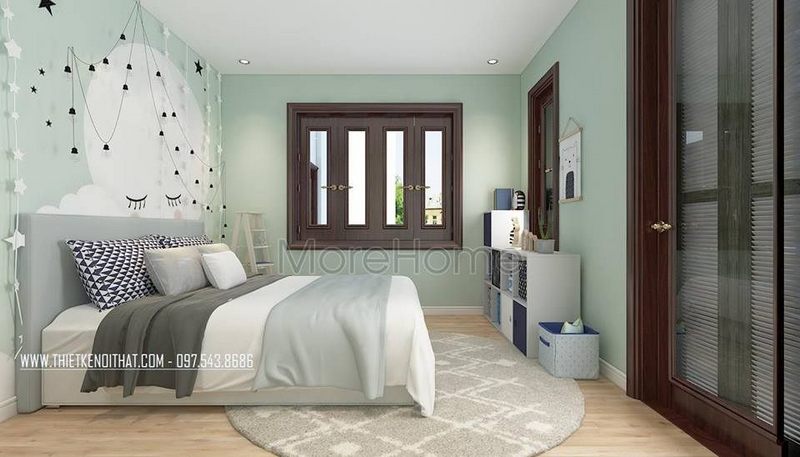 Thiết kế phòng ngủ cho bé với tông màu xanh mát nhẹ nhàng mang lại sự bình yên và dễ chịu. Thiết kế tủ kéo dài tạo ấn tượng về sự tiện lợi và trẻ trung.
