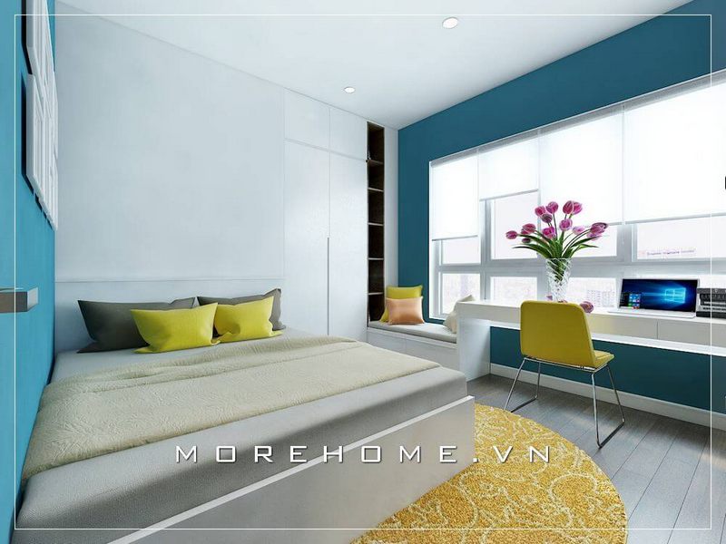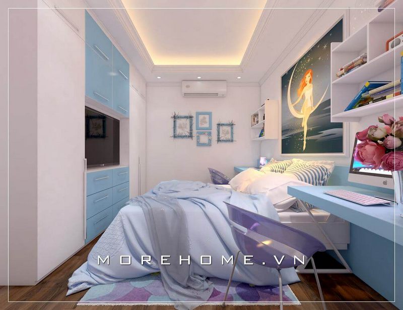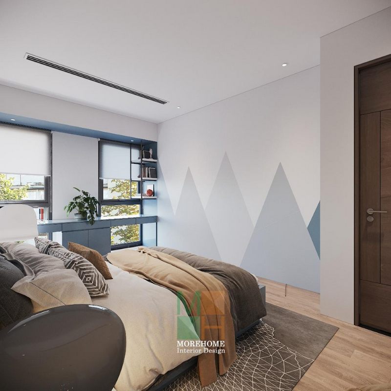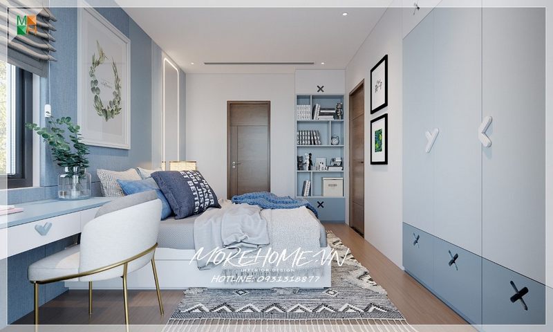 Thiết kế phòng ngủ cho bé có bàn học với tông màu xanh da trời chủ đạo mang tới không gian sinh động mới mẻ đáp ứng đầy đủ mục đích sử dụng của chủ nhân căn phòng.