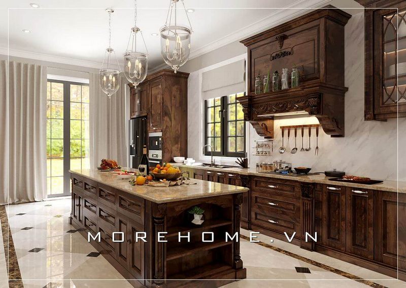 Tủ bếp gỗ óc chó tự nhiên cao cấp có đường nét hoa văn tân cổ điển được chạm khắc tỉ mỉ, góp phần tạo nên sự tinh tế, tỏa sáng cá tính và đẳng cấp của gia chủ.