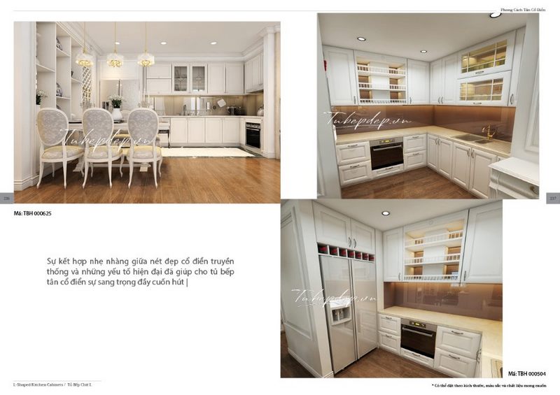 Không gian trong phòng bếp không rộng lớn nhưng bố trí bàn ăn gần và màu trắng của nội thất tân cổ điển làm cho không gian trở nên rộng rãi hơn.