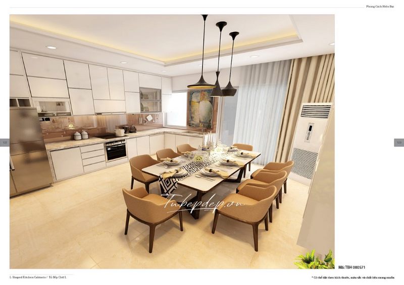 Một bàn ăn lớn với 8 ghế hiện đại được đặt trong không gian phòng bếp tiện nghi của các căn hộ chung cư, biệt thự, nhà phố, giúp tiết kiệm diện tích mà vẫn dễ dàng sinh hoạt.