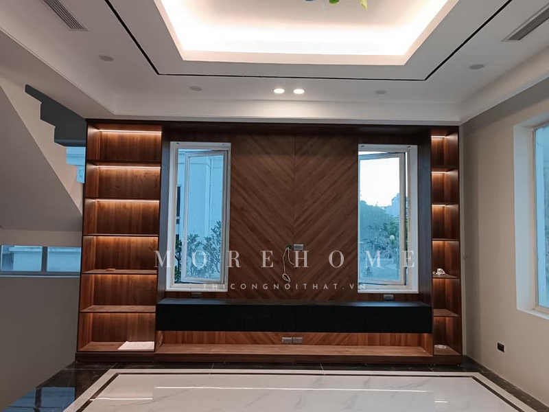Việc thi công kệ tủ gỗ tự nhiên với đèn leb tô điểm để trang trí, sắp xếp những món đồ sẽ giúp tạo nên một không gian sống sang trọng và thẩm mỹ.